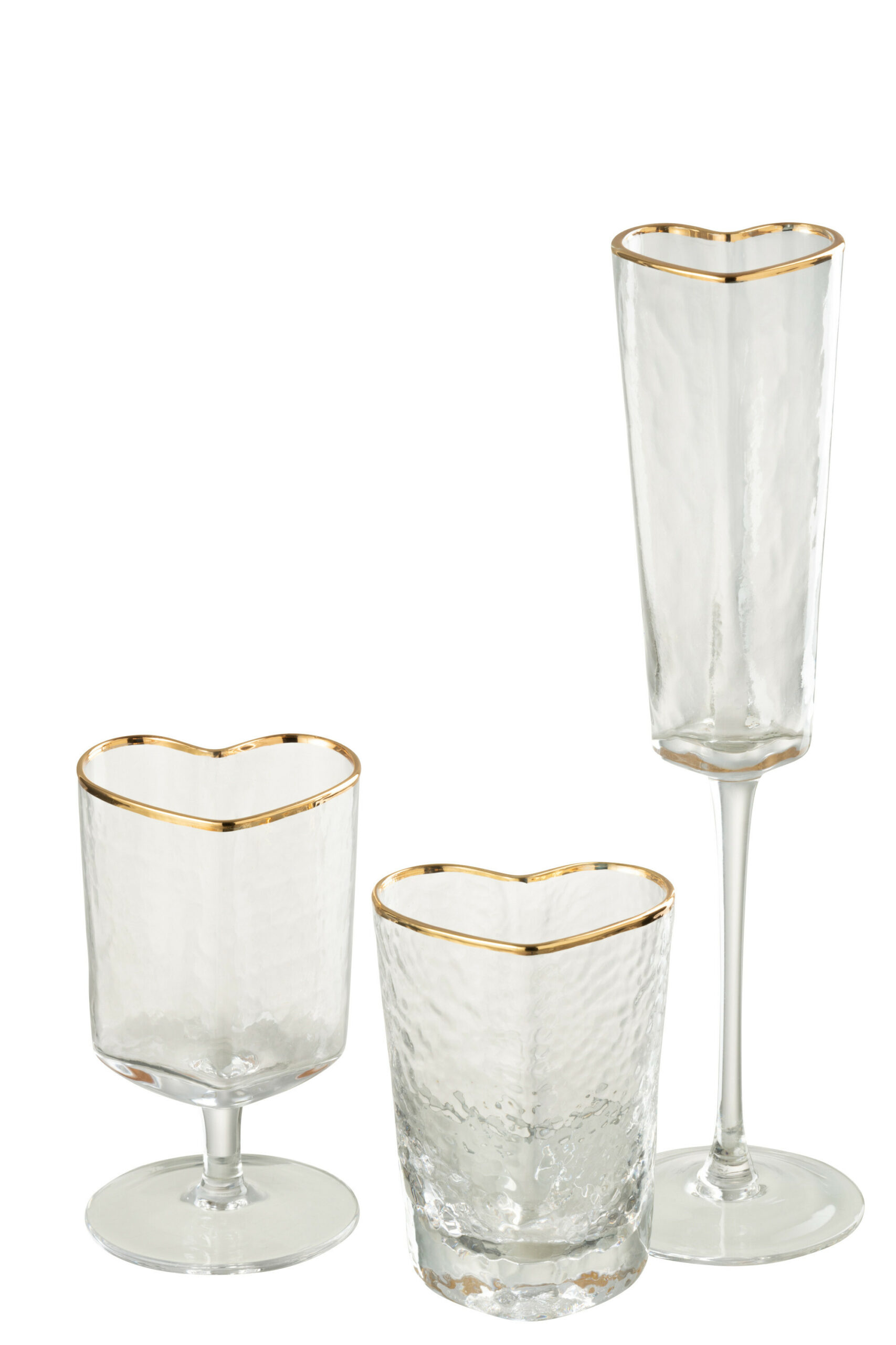 Flutes à champagne en forme de cœur en verre transparent et dorée.